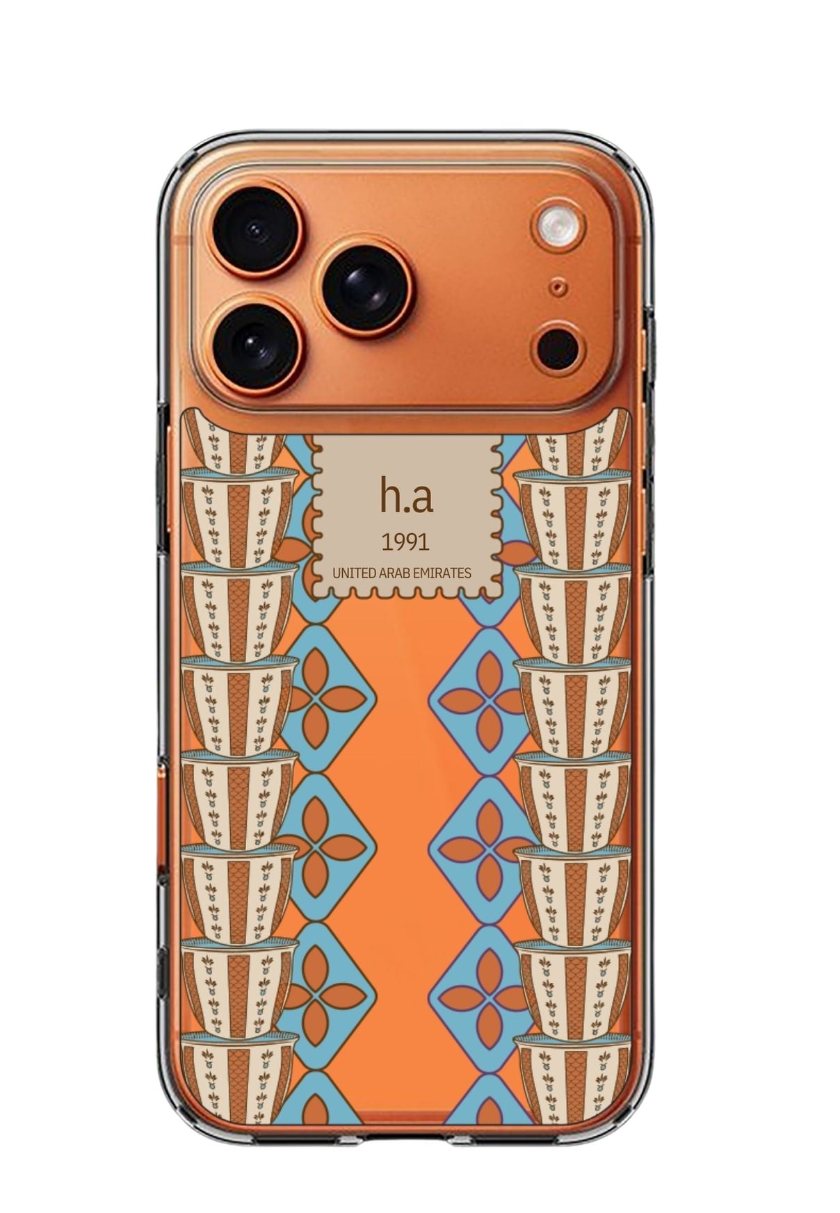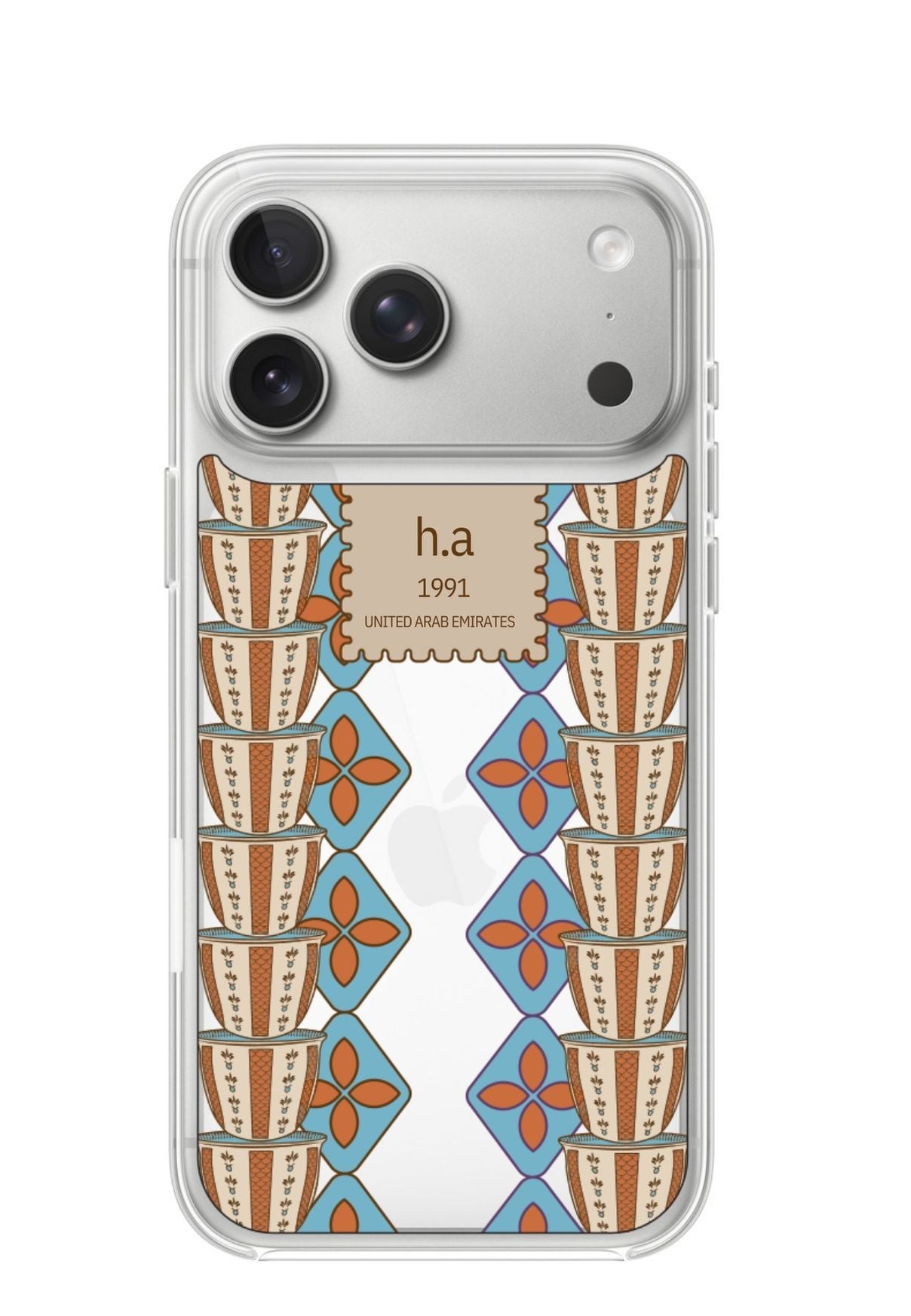 Celebrating the essence of UAE hospitality, this transparent case features a stylish pattern of traditional coffee cups paired with anti-yellowing technology for lasting clarity. It offers a unique way to honor heritage while allowing for full customization of names and special dates (such as "h.a 1991") to create a truly personal accessory.