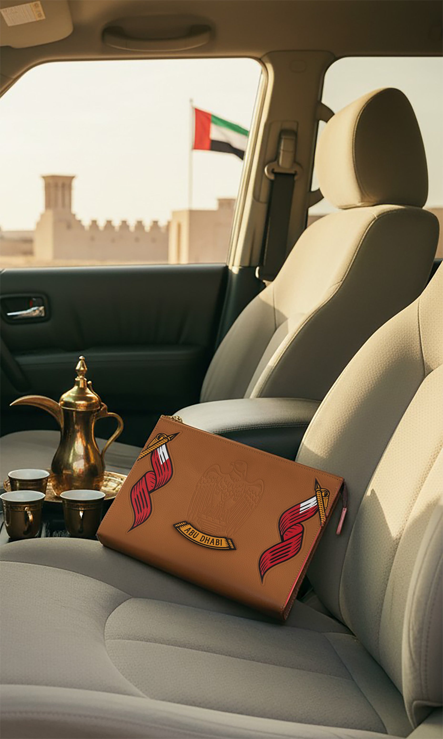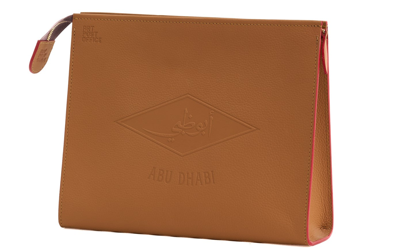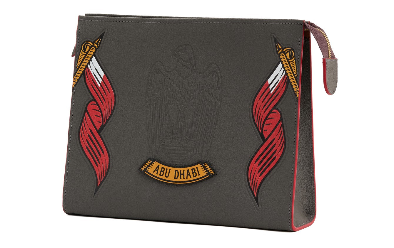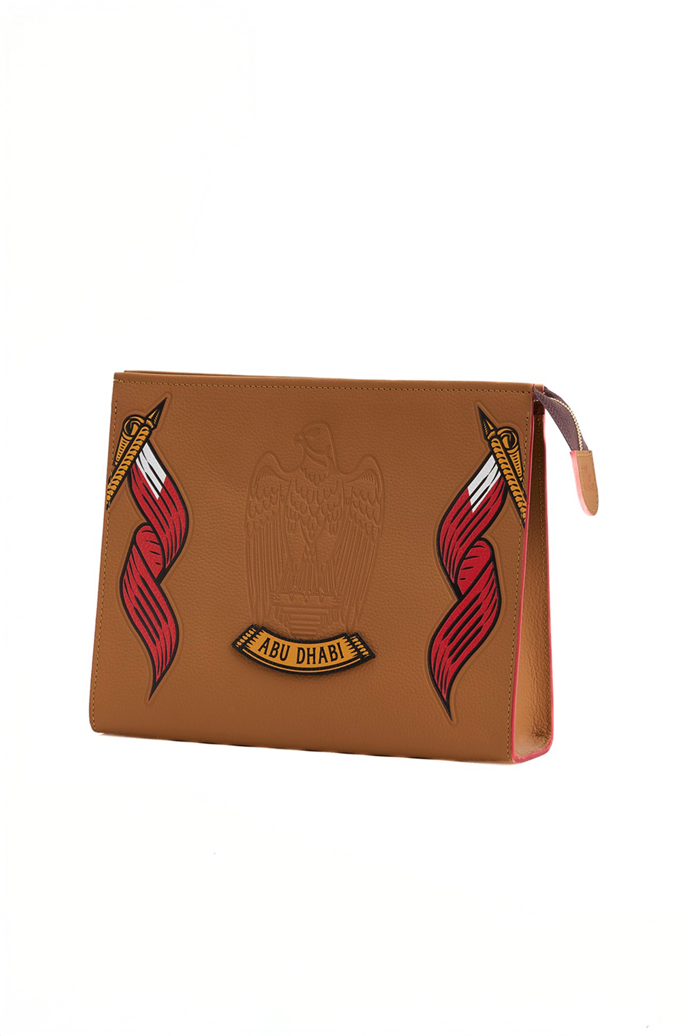 An elegant pouch from the new AbuDhabi Classic collection, crafted from 100% pure premium locally sourced leather. It features embossed details inspired by Abu Dhabi heritage, with distinctive artistic accents on the reverse side for a unique touch. Designed with a sleek zip closure and a practical interior space, it’s perfect for carrying your daily essentials in style—whether used as a chic clutch or a refined travel companion. A timeless piece that blends luxury, authenticity, and modern elegance inspired by the spirit of the UAE.
