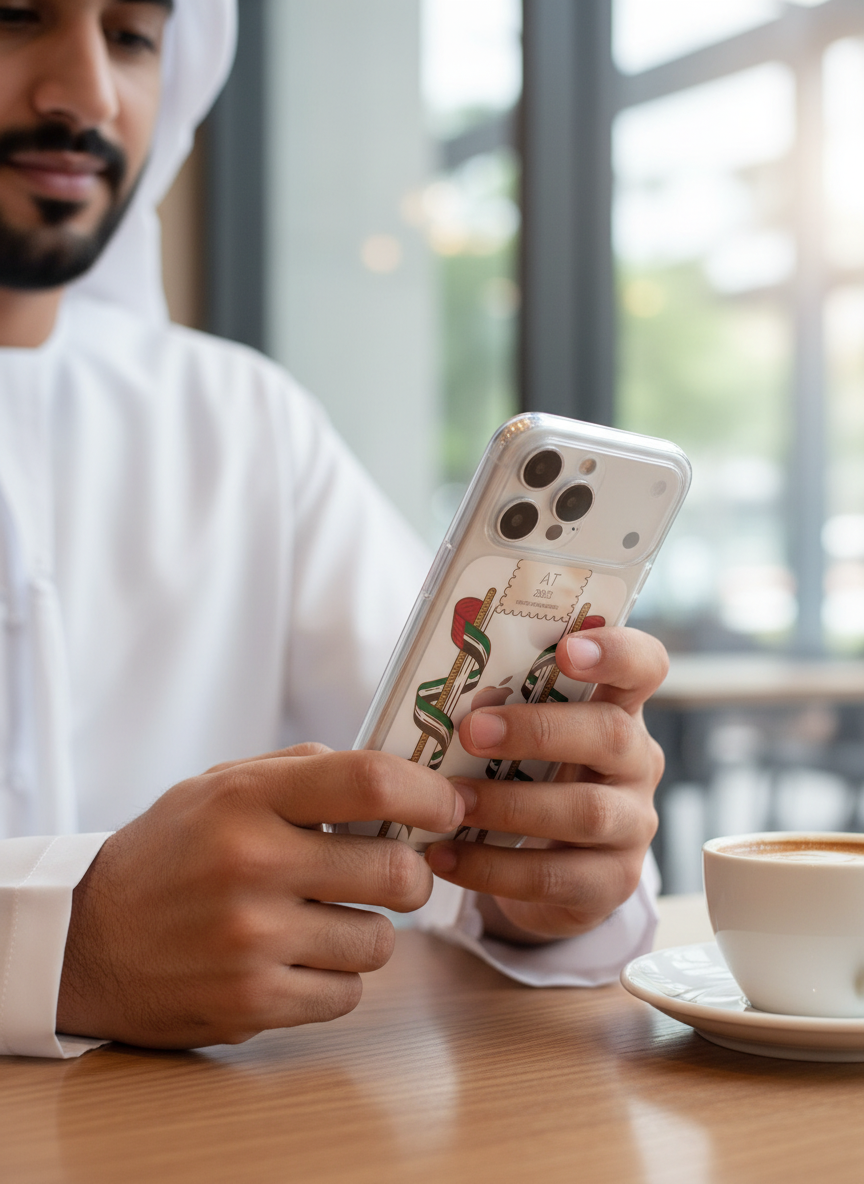 Combining the spirit of the UAE with premium protection, this transparent case is engineered with anti-yellowing technology to ensure lasting clarity. The design features vibrant ribbons in the colors of the UAE flag elegantly spiraling around traditional poles, creating a dynamic tribute to national pride. With the ability to fully customize names and significant dates (such as "AT 2003"), this case offers a durable and deeply personal way to showcase heritage every day.